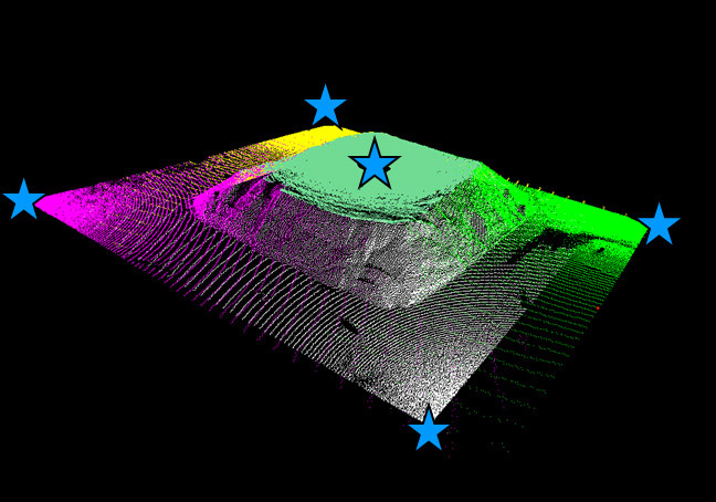 3.複数データ合成計測データを合成するために現地計測時に反射ターゲットを周辺に複数個所設置して地上レーザースキャナで対象地形を計測します。(レーザー座標系に基づく値)。反射ターゲットの位置はトータルステーションなどでなどで別途計測します(現地座標に基づく座標値)。レーザー座標系と現地座標系双方の反射ターゲットの座標値を利用して、各3D データを座標変換し、複数データを現地座標系に基づいたデータにします。これにより複数個所のデータが合成されます。
