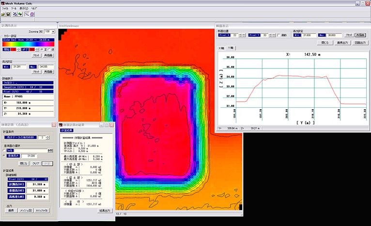 6.体積計算複数個所のデータを合成後、不要なデータやノイズを削除します。その後、3Dモデル(TINモデル)を作成し、断面図や等高線図、体積計算などの成果を制作します。詳細な3Dモデルを作成することにより、データ上で現地地形をトレースする感覚でデータを扱うことが可能になります。