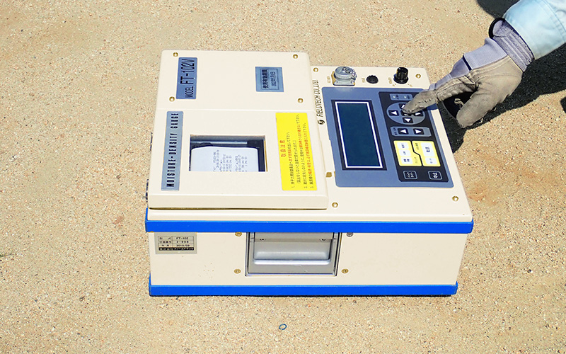 RI計器・FT-102は1分間の測定で湿潤密度と含水量(または水分密度)を求めることができます。装置の画面及び印字データとして表示され、乾燥密度や含水比なども計算しUSBによりデータ出力します。